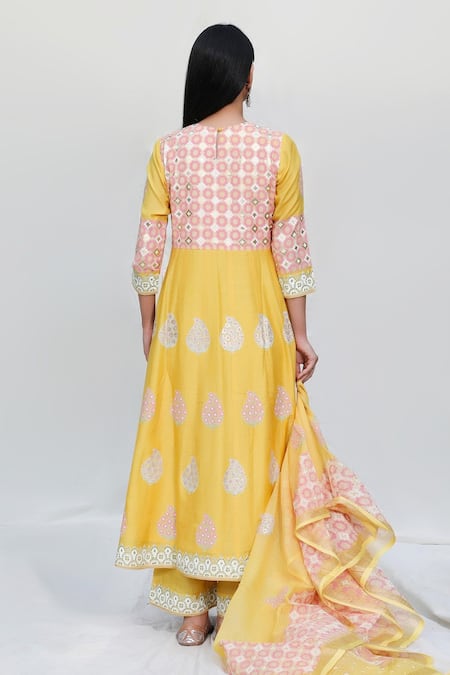 Yellow Cotton Silk Dupatta Handloom Kota Round Foil Block Print Anarkali Set