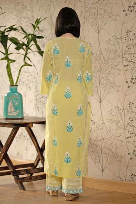 Lemon straight long kurta with floral motif print, potli buttons & lace finish. Paired with pants & chiffon dupatta.