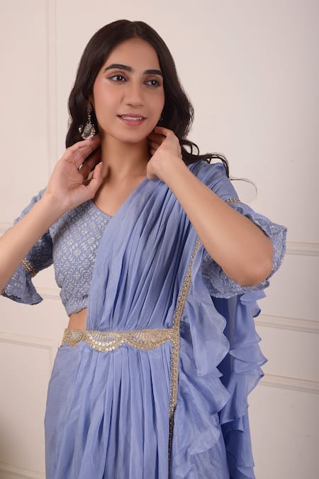 Powder blue pre-draped saree featuring lace and ruffle trimmed border. Paired with a matching lucknowi embroidered blouse with bell sleeves.