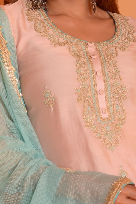 Peach kurta featuring dori embroidered floral and paisley motifs highlighted with gota lace embellishments. Paired with matching palazzo and dupatta.