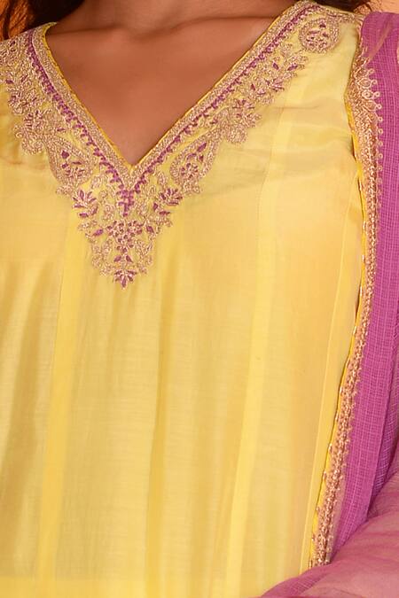 Yellow Cotton, Silk Embroidery, Gota Placement Floral Anarkali Palazzo Set