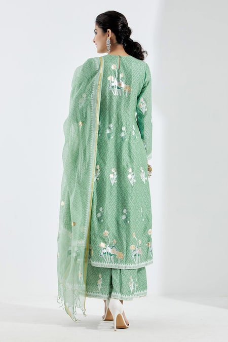 Pista green anarkali in foil print, comes with gota detailing. Paired with a kalidar palazzo and dupatta in block print with gota kingri lace.