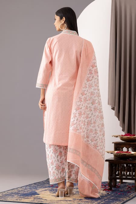 Pink kurta featuring polka dot print and lace embroidered neckline. Paired with floral print salwar and a printed dupatta.