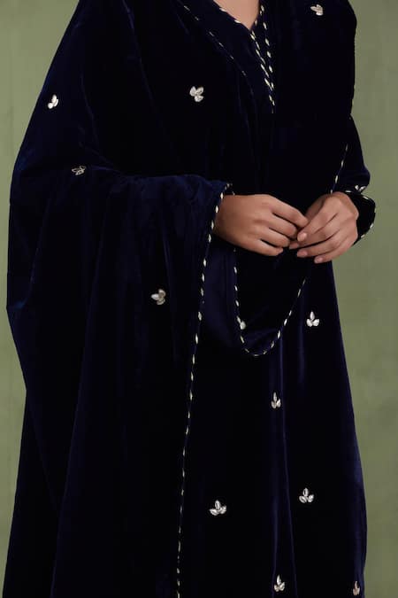 Midnight blue velvet shawl featuring gota embroidered leaf motifs