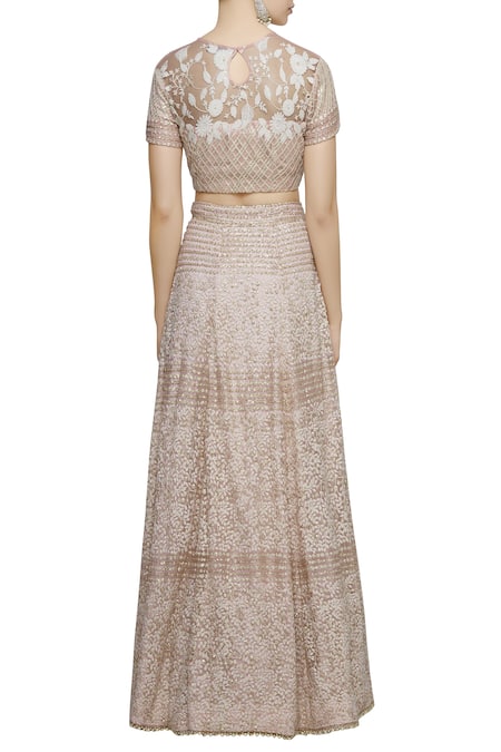 Destined to turn heads with its impeccable design,this pastel pink toned ensemble offers a regal take on the upbeat summer wedding occasion. It is masterfully crafted in the handpicked soft net,features a clean-cut comfort silhouette and oranted with the heavy chikankari hand embroidery all over. It comes with the illusion neckline blouse,flared lehenga and completed with the coordinating dupatta.