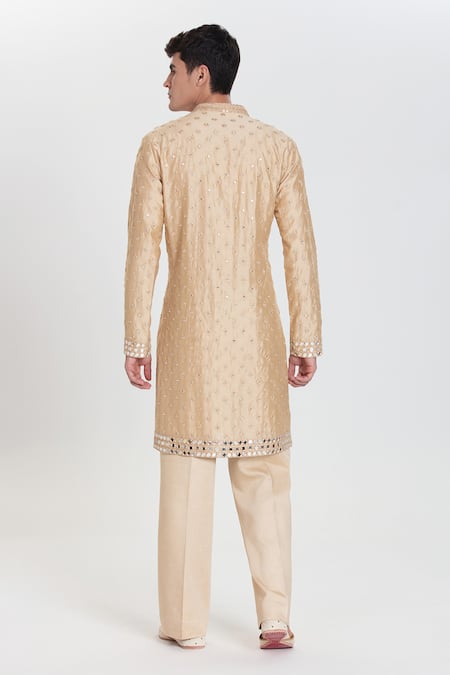 Beige kurta featuring resham and mirror work with a mandarin collar. Paired with matching beige pants.