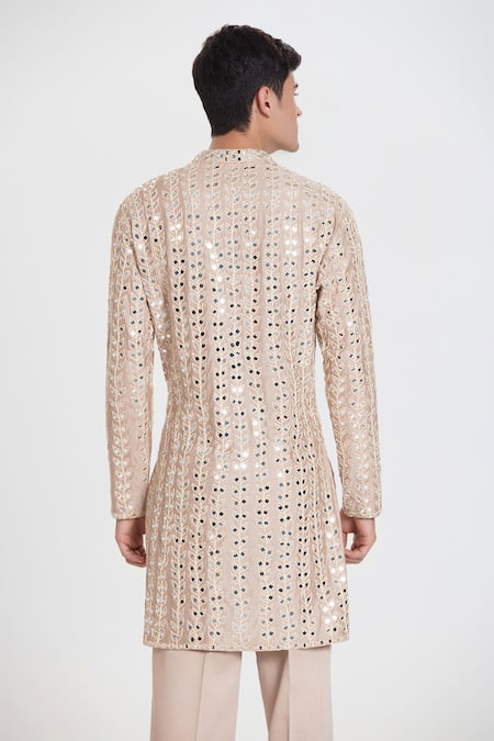 Beige kurta featuring resham and mirror work in a special heavy Chanderi fabric. Paired with matching pant and dupatta.