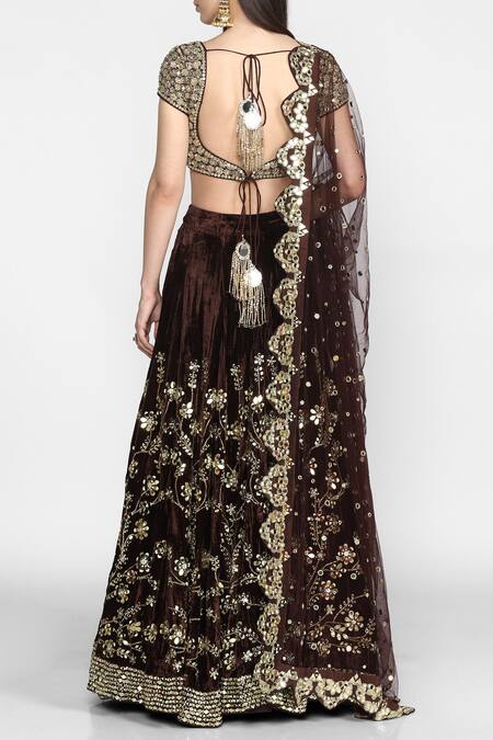 Brown Raw Silk, Net, Velvet Leaf Neck Embellished Lehenga Set