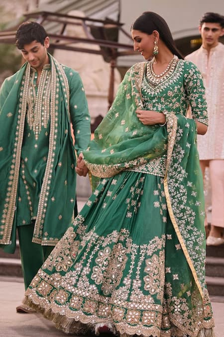 Emerald green padded kurta featuring gota, zari thread, and mirror embellishments in a floral pattern. Paired with a pleated embroidered lehenga and a border embroidered sheer dupatta.