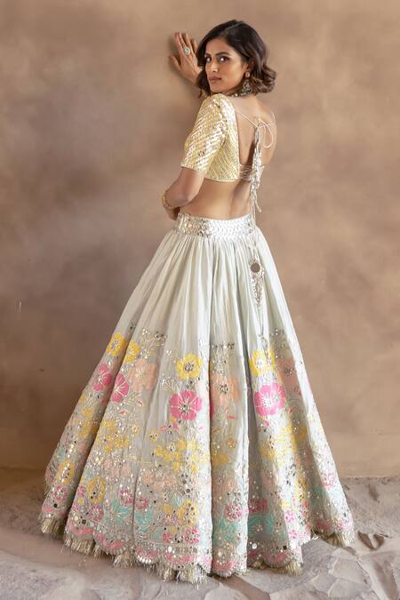 Blue bridal lehenga featuring floral embroidery with mirror, resham, and zari work. Paired with a padded blouse and a dupatta with scallop border and gota embroidery.