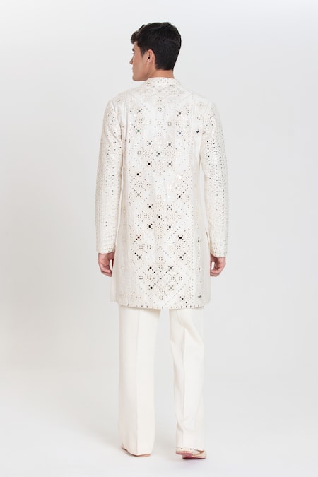 Ivory kurta featuring resham and mirror work with a mandarin collar. Paired with matching ivory pants made from special heavy chanderi fabric.