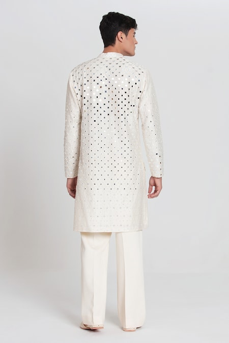 Ivory kurta featuring resham and mirror work with a mandarin collar. Paired with matching pant and dupatta.