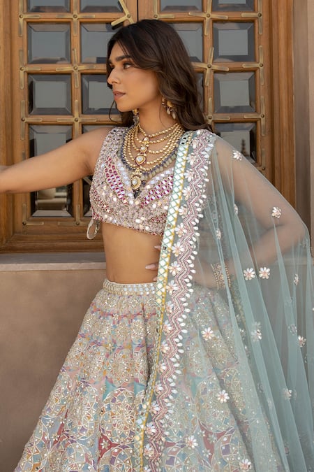 Multi color lehenga featuring intricate gota, mirror, and zari embroidery. Paired with a padded blouse and embroidered dupatta with a back tie-up tassel.