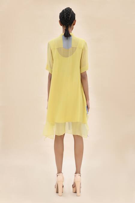 Yellow shirt dress with contrast panels & mother of pearl front button placket. Comes with inner.