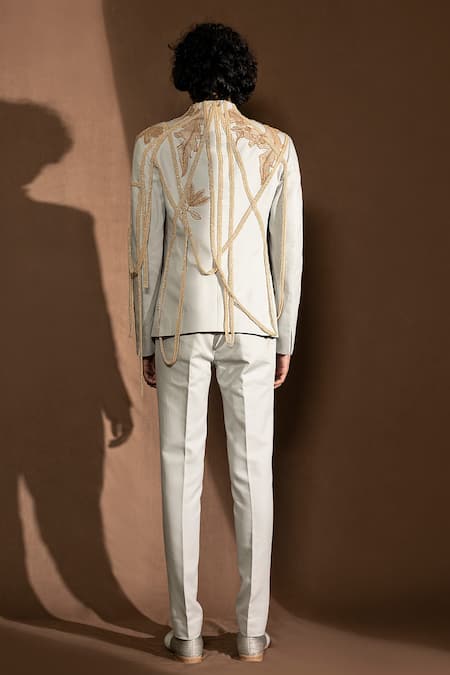 Grey Suiting Fabric Glass Bead Cords And Double Breasted Embellished Jacket