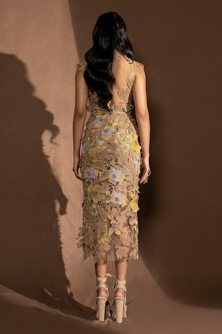 Dusk net fitted dress with high neck, ombre gold embellished filigree inspired metallic delicate katana embroidery & beaded cords embellishment.