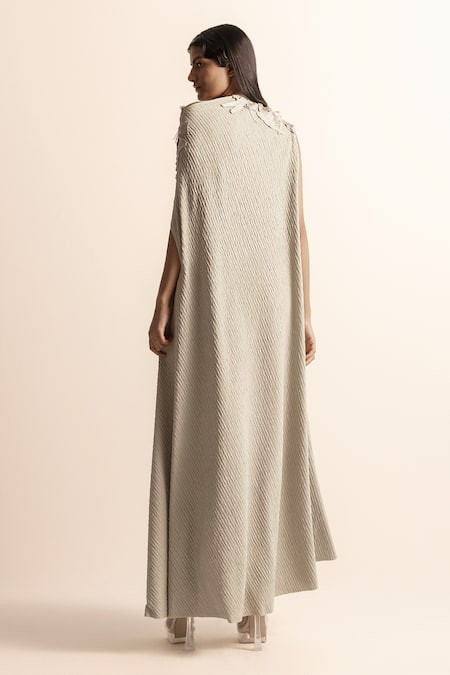 Yarn motifs embroidered on the shoulder, Bead strings detailing along the neckline, Asymmetrical hem design