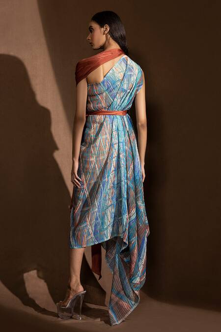 Multi Color Poly Georgette One Shoulder Draped Dress