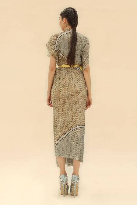 Olive asymmetric dress with tie dye print, overlap draped shoulder, contrast panel & striped detail.