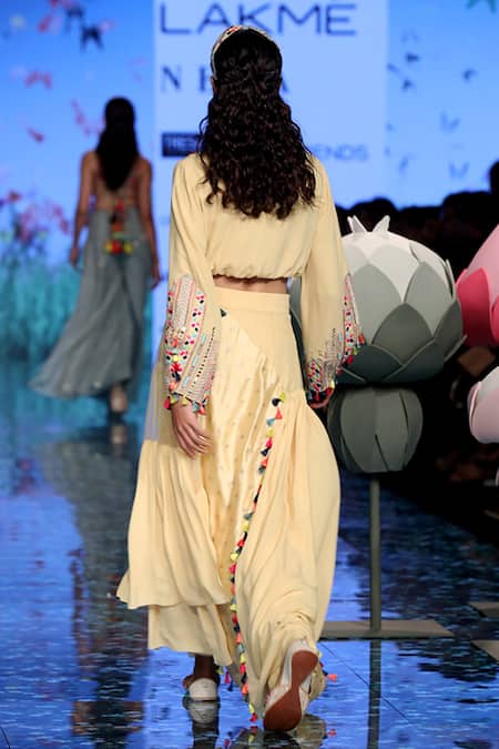 Pale yellow balloon crop top with multicolor thread embroidery. Comes with asymmetrical skirt.