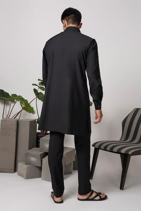 Black kurta featuring off-white and gold beaded embroidered geometric shapes, complemented by a mandarin collar and full sleeves. Paired with matching trousers, this set is crafted from terry rayon fabric.