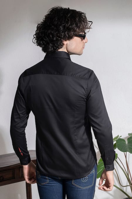Black slim fit shirt featuring vibrant embroidered details on the front
