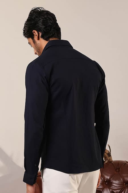 Black shirt featuring a collar and full sleeves with a curvy lace embroidered yoke