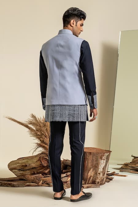 Sky blue bundi featuring hand-pleated and pintuck detailing. Paired with an embroidered navy blue kurta and panelled trouser.