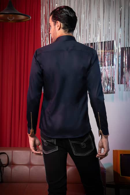 Navy blue shirt featuring a collared neck and full sleeves with a placement patch pocket