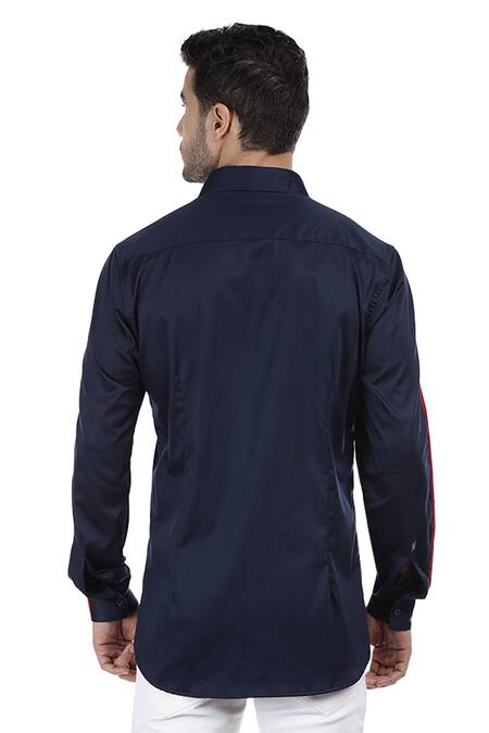 Navy blue slim-fit shirt with applique stripes & front button placket.