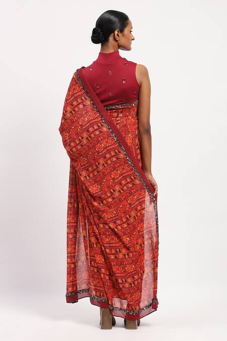 Intricate Rabari print design, Contrasting border detailing, Sequin embellishments on the blouse