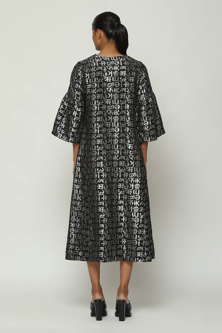 Black Chanderi Cut Work V-neck Calligraphy Zari Pattern Midi Dress