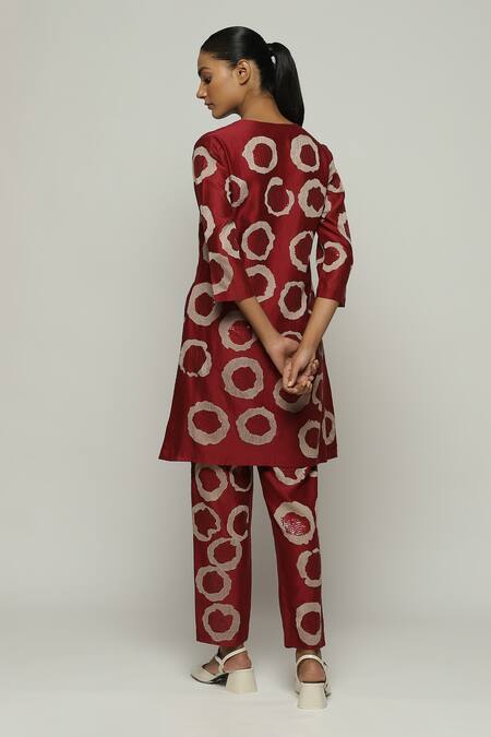 Wine kurta featuring aari, sequin, and thread embroidery in a ring pattern
