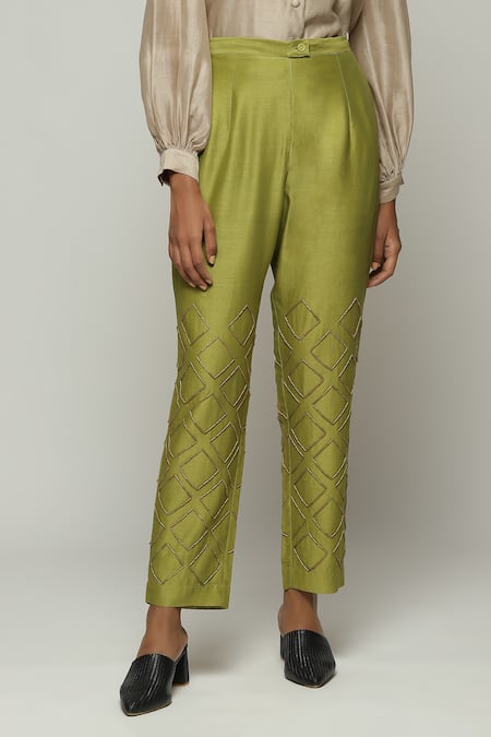 Green Chanderi pant featuring geometric butti embroidery and side pockets
