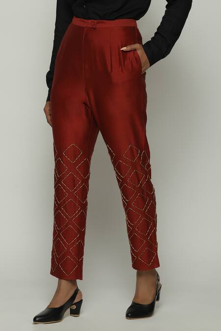 Red straight fit pant featuring geometric butti embroidery and side pockets