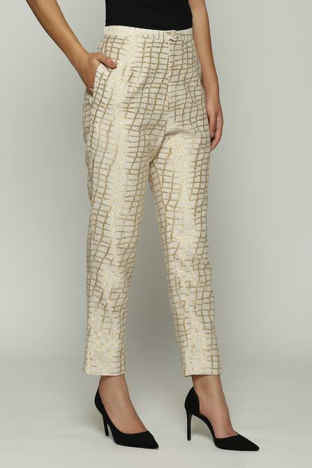 Ivory straight pant featuring an all-over chequered brocade pattern