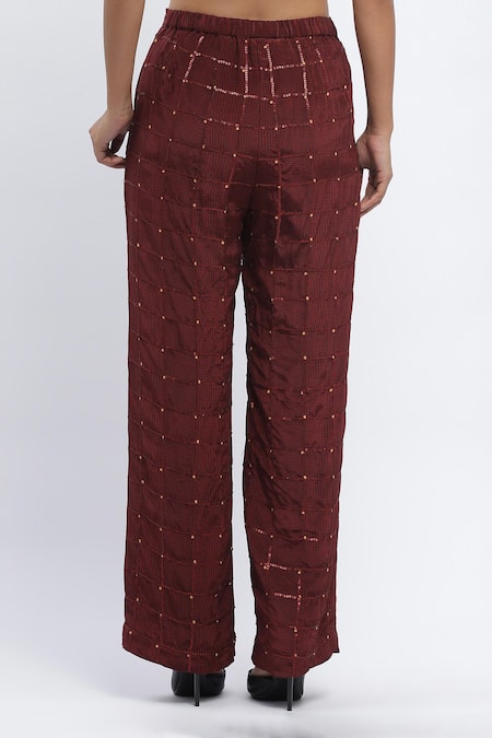 Burgundy trouser featuring all-over dot chequered prints and sequin embroidery