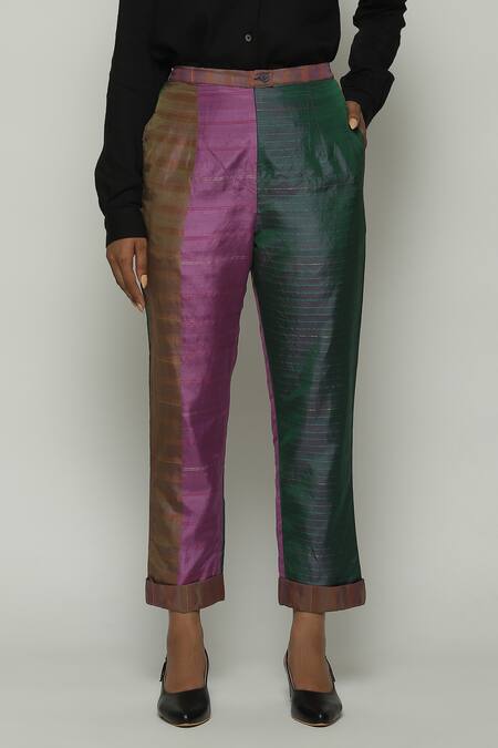 Purple and green silk pant featuring color block panels and a woven stripe pattern