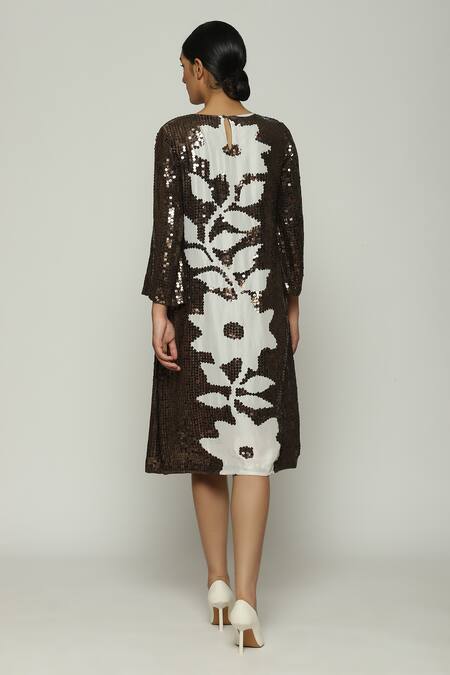 Brown silk A-line dress featuring contrast placement floral print and tonal sequin embroidery