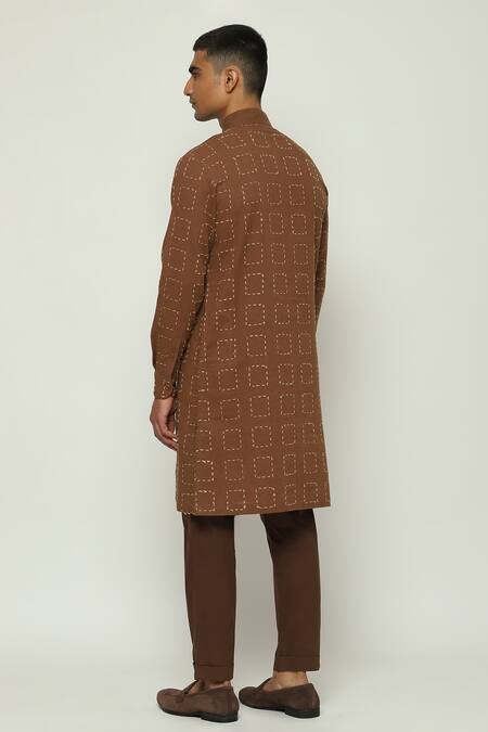 Maroon kurta featuring geometric thread embroidery with a band collar and long sleeves