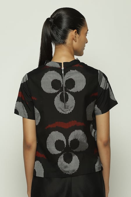 Black Silk, Cotton High Neck Ikat Ottoman Moon Print Top