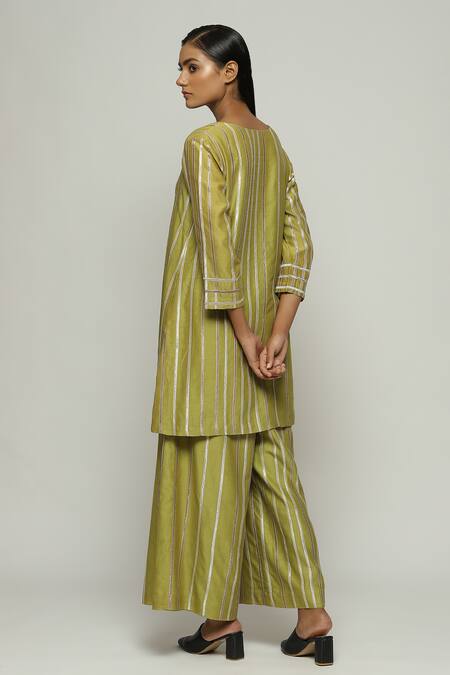 Green Chanderi tunic featuring round neckline and three-quarter sleeves