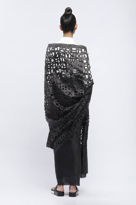 Black saree featuring intricate laser cut details and scalloped edges