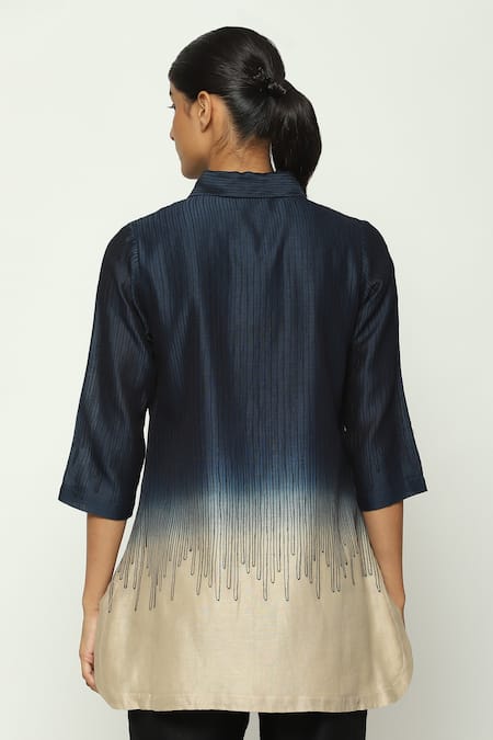Blue Chanderi Embroidery Collared Ombre Crewel Shirt