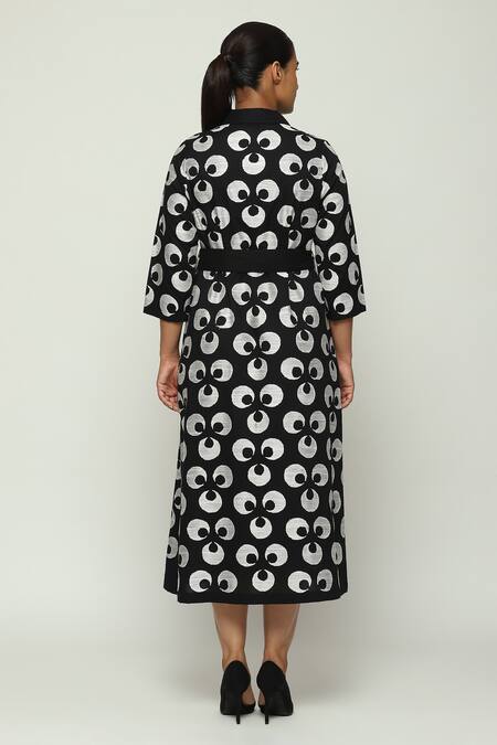 Black Cotton Collared Ottoman Moon Pattern Midi Dress