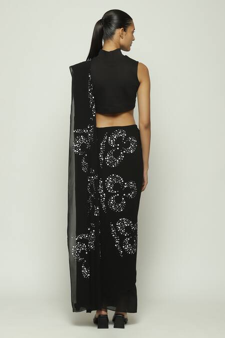 Black saree featuring Ottoman Turkish moon embroidery with sequins and bead highlights