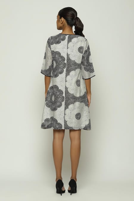 Black & white A-line dress featuring a V neck and three fourth sleeves with an all-over Kantha bloom print