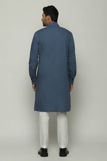 Blue Poplin Pleated Check Long Band Collar Kurta