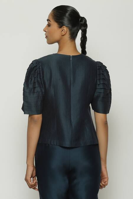 Blue Chanderi Embroidery Round Neck Pleated Puff Sleeve Top