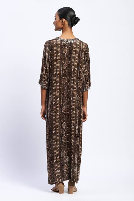 Brown kaftan featuring geometric print and adda embroidery with sequins work